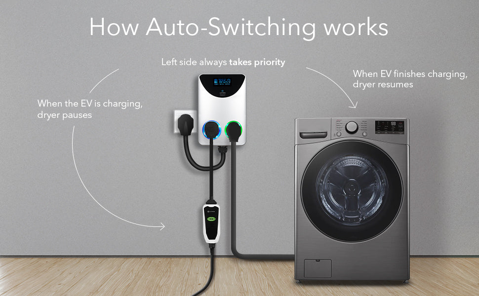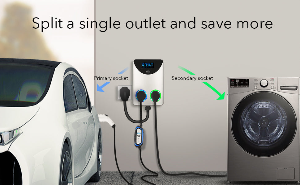 CHARGE MORE CONVENIENTLY: This Lectron EV power splitter lets you use one outlet to power your Level 2 EV charger and high-powered appliance (washer, dryer, etc) - eliminating the need to install a second high-powered NEMA outlet in your home.